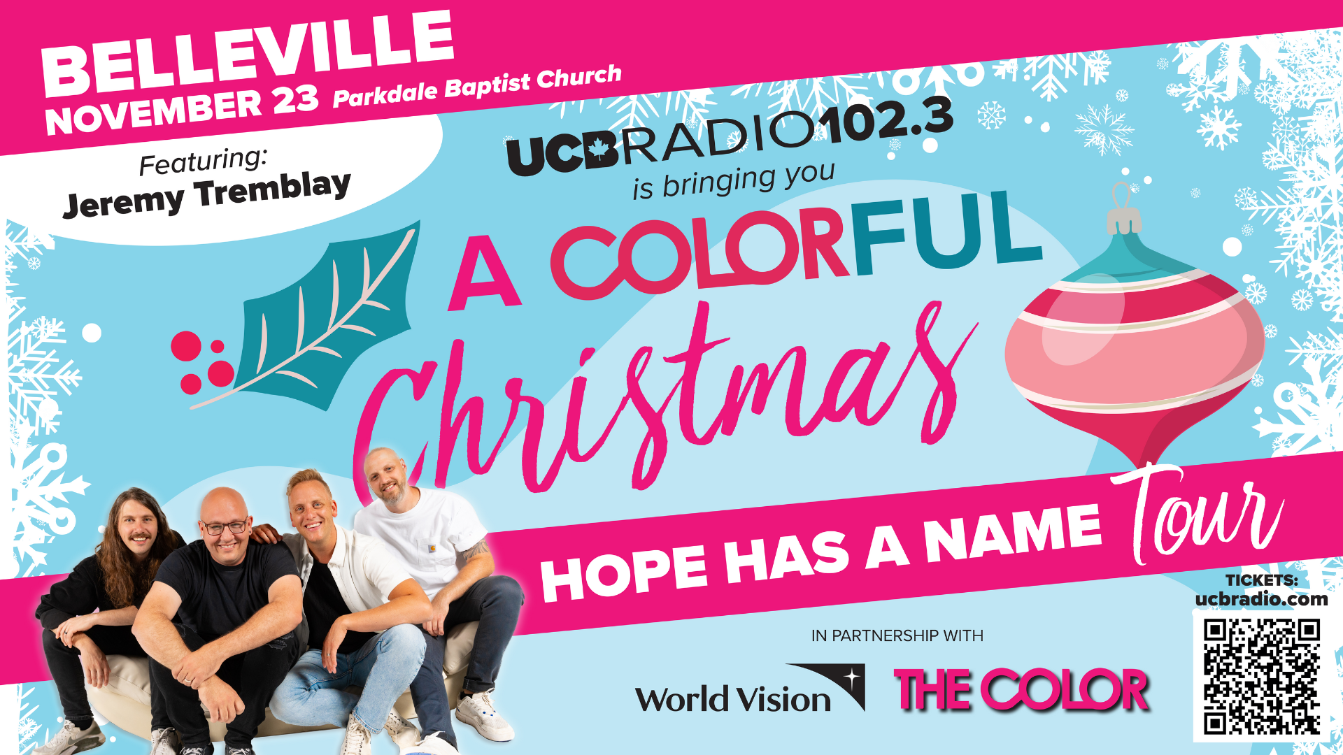 Celebrate the season with The Color and Jordan Janzen on their Christmas Tour: Hope Has A Name! Enjoy powerful music, heartfelt moments, and holiday joy for the whole family. With special guest: Jeremy Tremblay! In partnership with World Vision. General Admission Tickets will be available at the door for $20
