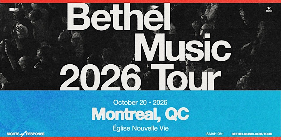 A night of worship and ministry with Bethel Music in Quebec. Join Bethel Music for a powerful night of worship and ministry as we gather to lift up Jesus. Come expectant. Come surrendered. Come ready to encounter His presence.