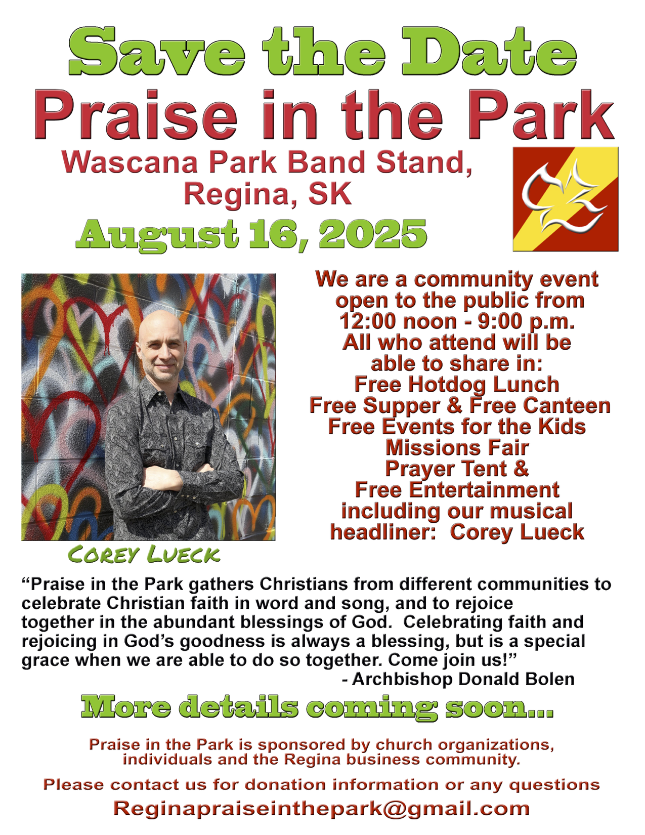 Praise in the Park gathers Christians from different communities to celebrate Christian faith in word and song, and to rejoice together in the abundant blessings of God. Celebrating faith and rejoicing in God's goodness is always a blessing, but i s a special grace when we are able to do so together. Come join us!
